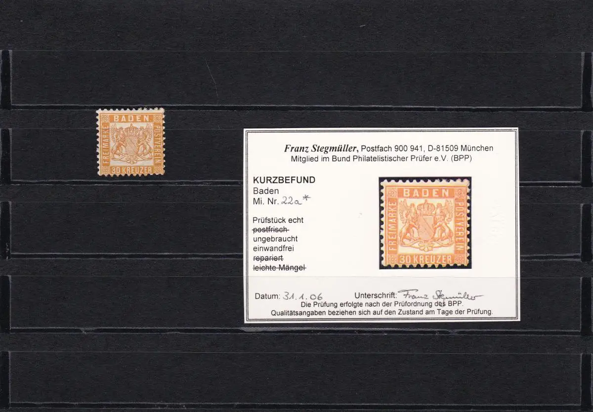 Baden: MiNr. 22a, ungebraucht, BPP Befund