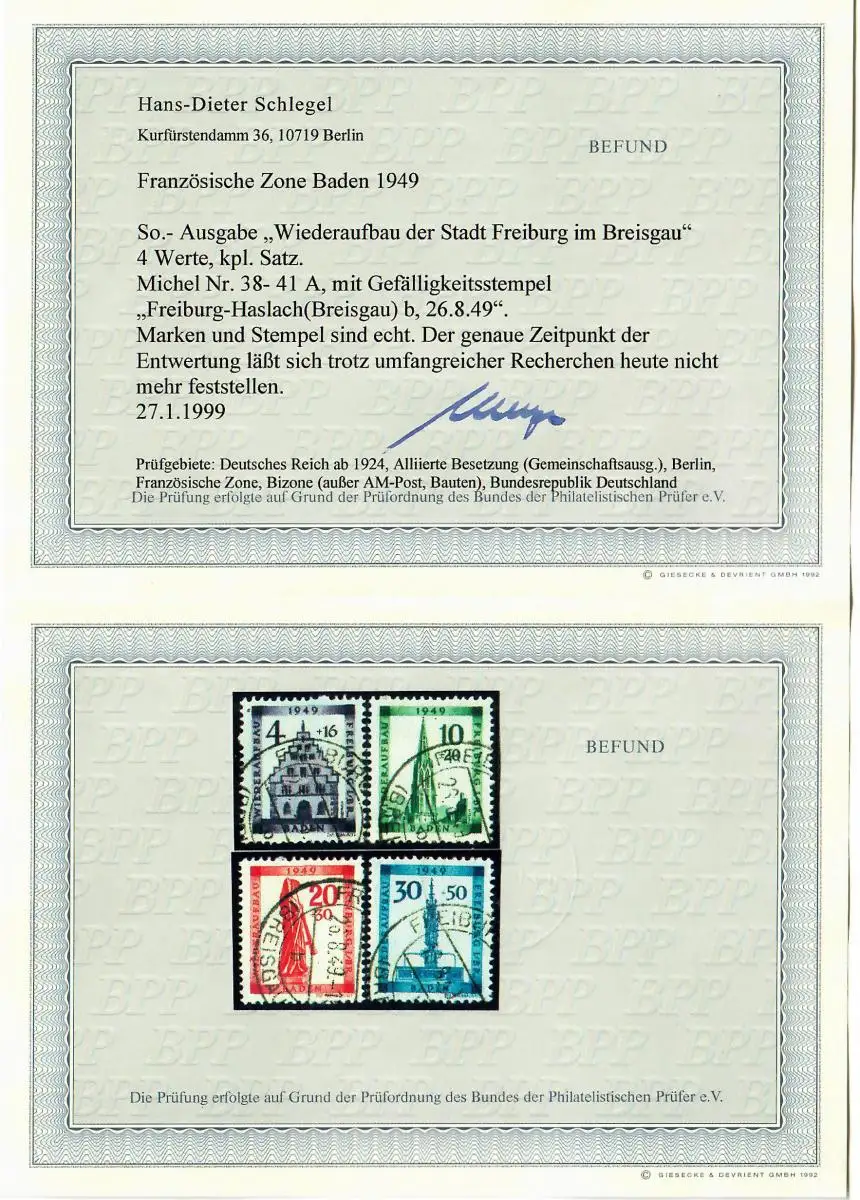 Baden: MiNr. 38-41 A, Stempel Freiburg Haslach, BPP Befund