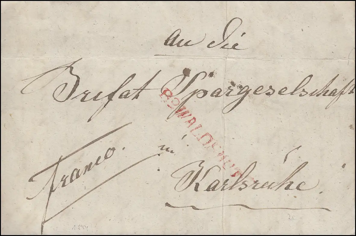 Baden Vorphilatelie Brief von 1844 mit Einzeiler rot R2 WALDSHUT nach Karlsruhe