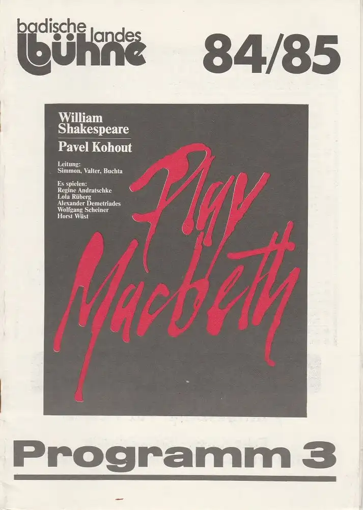 Badische Landesbühne Bruchsal, Alf Andre, Franz Cisky: Programmheft Play Macbeth von William Shakespeare / Pavel Kohout. Premiere 14. November 1984 Spielzeit 1984 / 85 Heft 3.