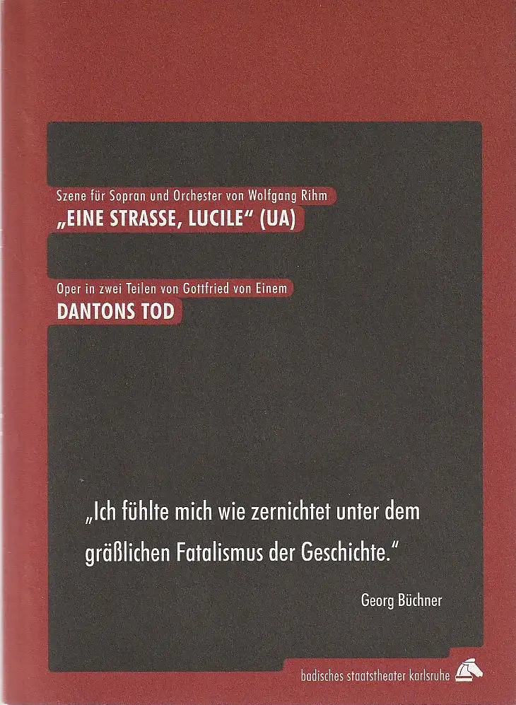 Gottfried von Einem DANTONS TOD. Szene für Sopran und Orchester / Oper in zwei Teilen. Musikalische Leitung: Jochem Hochstenbach. Regie: Alexander Schulin. Bühne: Bettina Meyer. Kostüme: Ursina Zürcher. Mitwirkende: Diana Tomsche, Stefan Stoll, Bernhard Berchtold, Andreas Heideker, Klaus Schneider, Ulrich Schneider, Edward Gauntt, Lukas Schmid, Sebastian Haake, u.a. - Theaterprogramm, Opernprogramm, Ballettprogramm, Musicalprogramm, Konzertprogramm, Theatermemorabilia, Programmhefte Sammlung, deutsche Theatergeschichte.