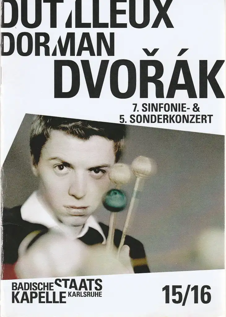 Badische Staatskapelle. Martin Grubinger, Percussion. Dirigent: Justin Brown. Programmfolge: HENRI DUTILLEUX: Le Lpup. Musik zum Ballett in drei Bildern von Jean Anouilh & Georges Neveux. AVNER DORMAN: Frozen in Time. Percussion Concerto. ANTONIN DVORAK: Sinfonie Nr. 7 d-Moll op. 70. - Theaterprogramm, Opernprogramm, Ballettprogramm, Musicalprogramm, Konzertprogramm, Theatermemorabilia, Programmhefte Sammlung, deutsche Theatergeschichte.