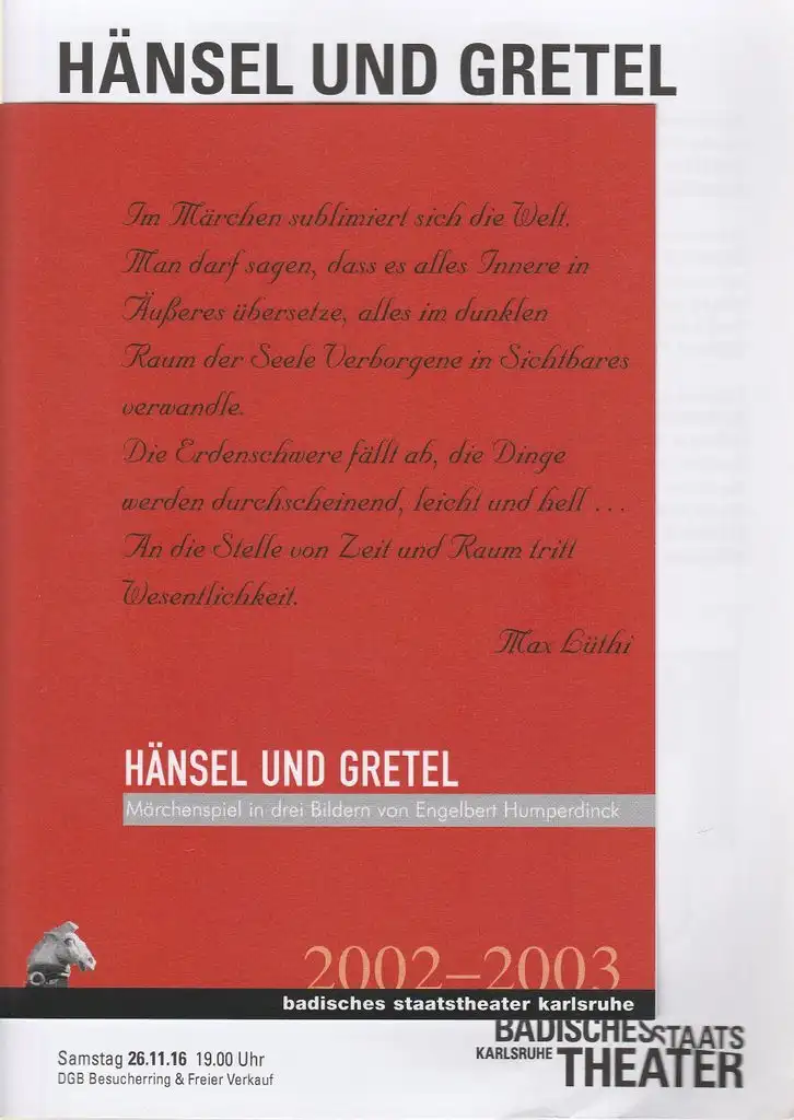 Märchenspiel in drei Bildern. Musikalische Leitung: Ulrich Wagner. Regie: Achim Thorwald. Bühne: Christian Floeren. Kostüme: Ute Frühling. Choreographie: Andrei Golescu. Mitwirkende: Edward Gauntt, Christina Niessen, Kristina Stanek, Andrea Bogner, Matthias Wohlbrecht, Dilara Bastar, Ilkin Alpay. - Theaterprogramm, Opernprogramm, Ballettprogramm, Musicalprogramm, Konzertprogramm, Theatermemorabilia, Programmhefte Sammlung, deutsche Theatergeschichte.