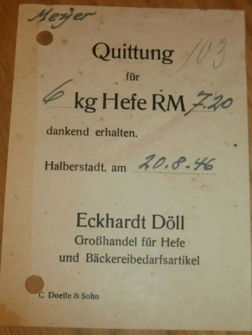 Bäckerei - Eckhardt Döll in Halberstadt , 1946 , 6KG Hefe , alte Rechnung , Reklame / Werbung !!