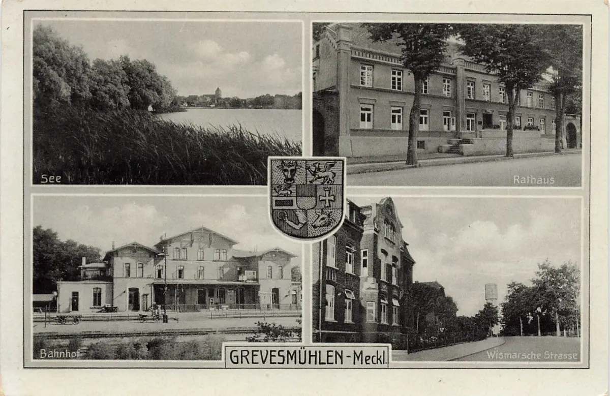 Bahnhof und Rathaus in Grevesmühlen Meckl. Panorama-Postkarte AK 1935
