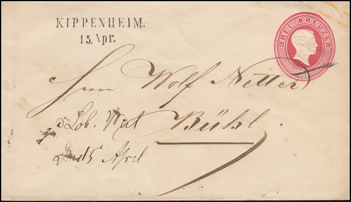 Bahnpost Baden Umschlag Großherzog Friedrich rot Zweizeiler KIPPENHEIM 15.4.