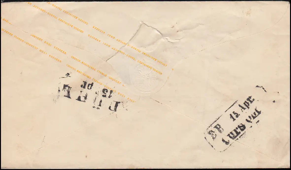 mit Bahnpost-Stempel "EB 15. Apr. Curs VIII", Ankunftsstempel BÜHL 15.4.