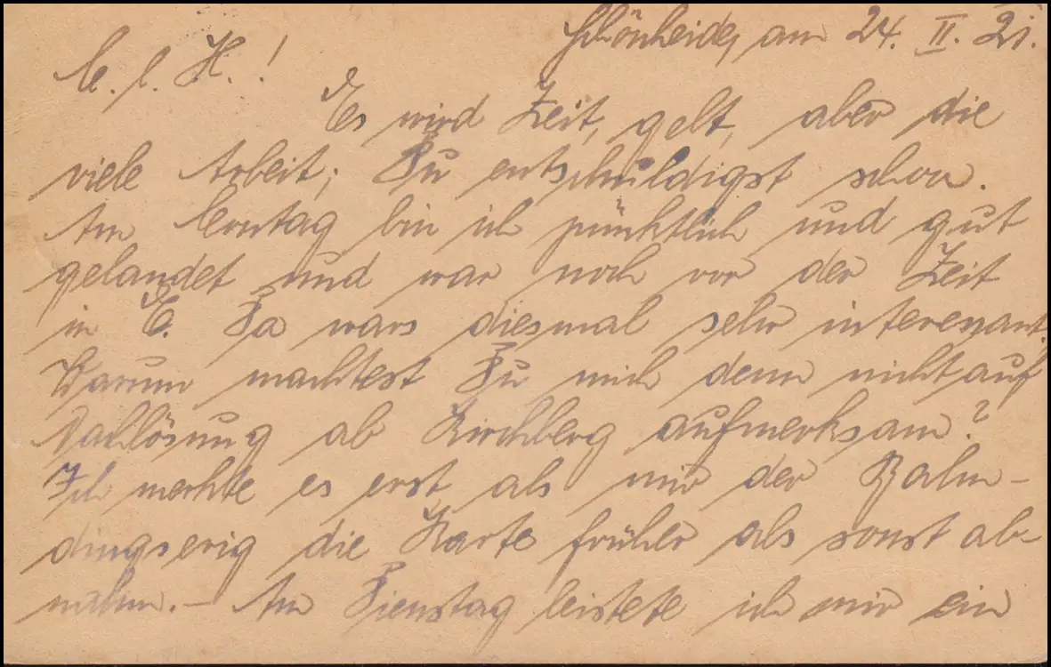 Bahnpost CHEMNITZ-AUE-ADORF ZUG 1765 - 21.2.1921 auf Postkarte nach Meerane