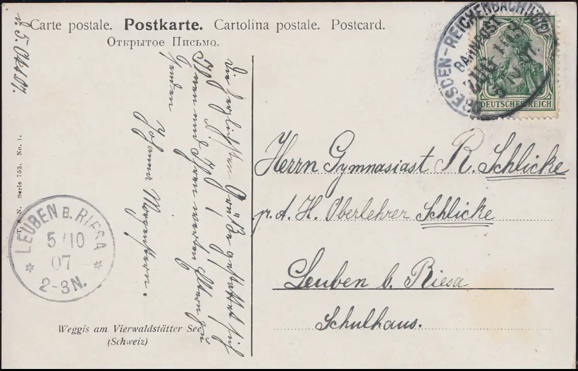 Bahnpost DRESDEN-REICHENBACH (VOGTL.) 5.10.1907 auf AK Weggis / Schweiz
