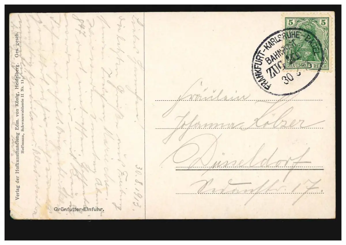 Bahnpost FRANKFURT-KARLSRUHE-BASEL ZUG 21 - 30.8.1913 auf AK Grünfutter-Einfuhr