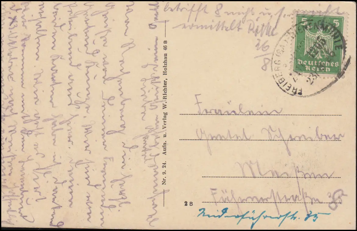 Bahnpost FREIBERG (SACHSEN) - BIENENMÜHLE ZUG 1205 - 23.8.1925 auf AK Rechenberg