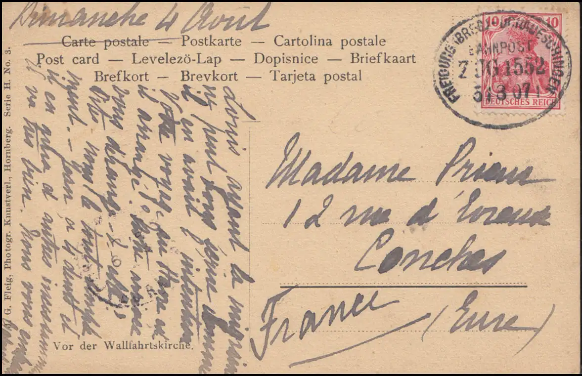 Ansichtskarte Vor der Wallfahrtskirche, befördert nach Frankreich