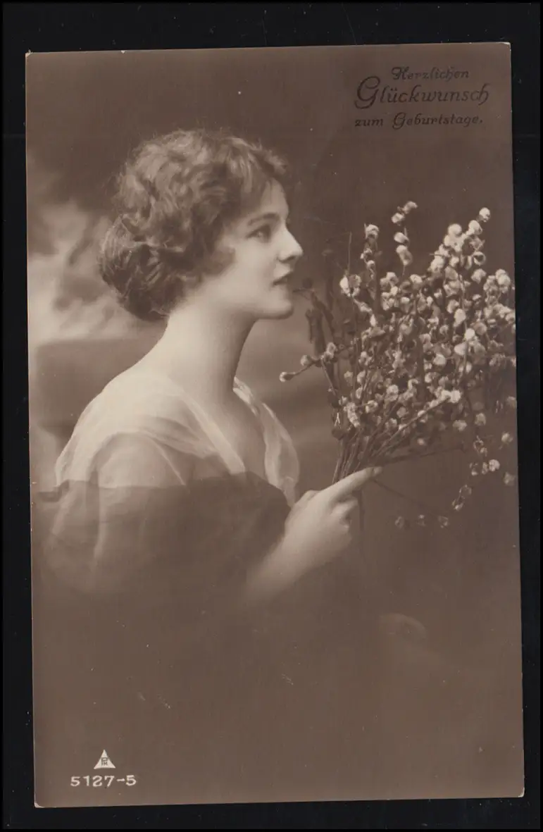 Bahnpost HANNOVER-HAMBURG ZUG 85 - 23.7.1925 auf AK Frau mit Weidenkätzchen