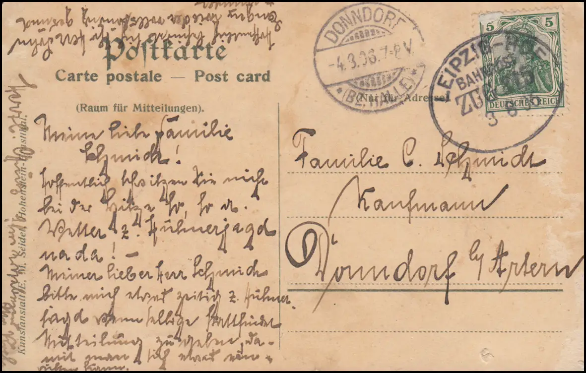 Bahnpost LEIPZIG - HOF ZUG 215 - 3.8.06 auf AK Crimitschau, nach DONNDORF 4.9.