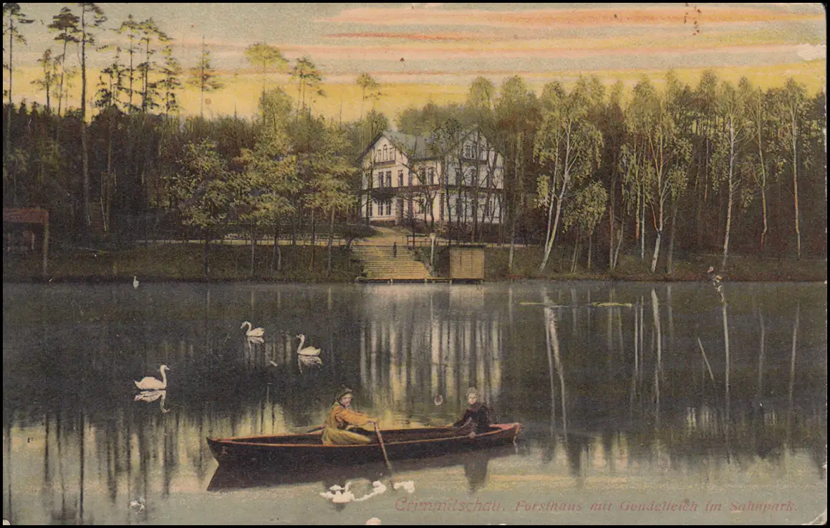 Ansichtskarte Crimmitzschau Forsthaus mit Gondelteich im Sahnpark, bildseitig unten leicht beschädigt