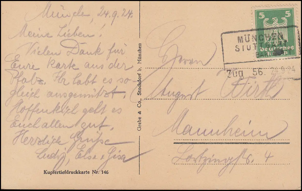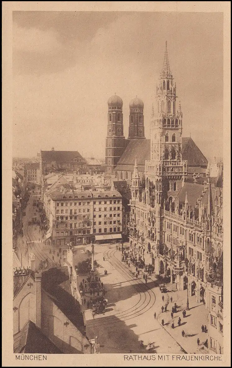 Bahnpost MÜNCHEN-STUTTGART ZUG 56 - 24.9.24 auf AK München Rathaus Frauenkirche