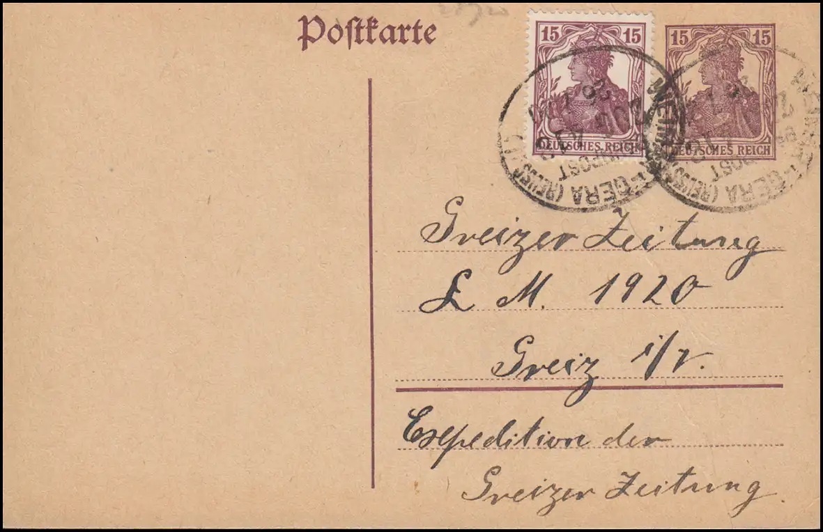 Bahnpost WEIMAR-GERA (REUSS) ZUG 418 - 26.7.1920 auf Postkarte nach Greiz