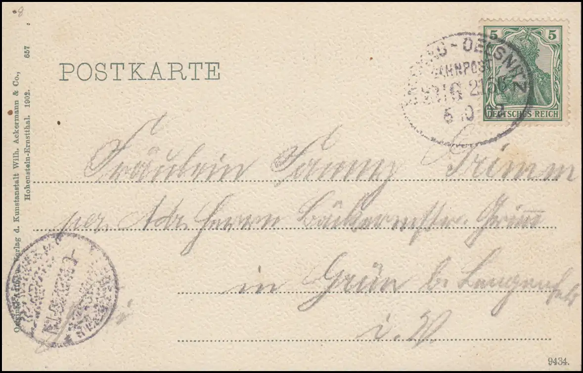Bahnpost ZWICKAU-OELSNITZ ZUG 2156 - 5.10.1902 auf AK Zwickau Muldenufer