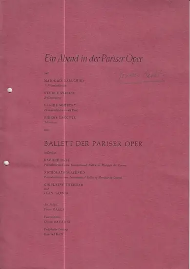 Titel: Programmheft zu: Ein Abend in der Pariser Oper. Mitwirkende: Majorie Tallchief, Claire Sombert, Pierre Lacotte. Daphne Dale, Nicholai Polajenko u.a. Tourneeleiter: Gerard Sayaret. Ballettmeister: George Skibine