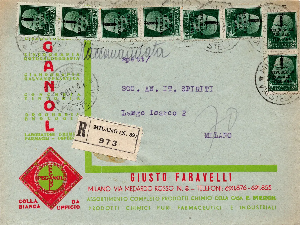 BÜSTE - Band Auflage von Verona Cent. 25 Nr. 491 acht Exemplare auf Umschlag Racc. von Mailand in die Stadt am 28.11.44 Werbung Kleber Peganol - Selten Mehrfachverwendung Cod.356/182
