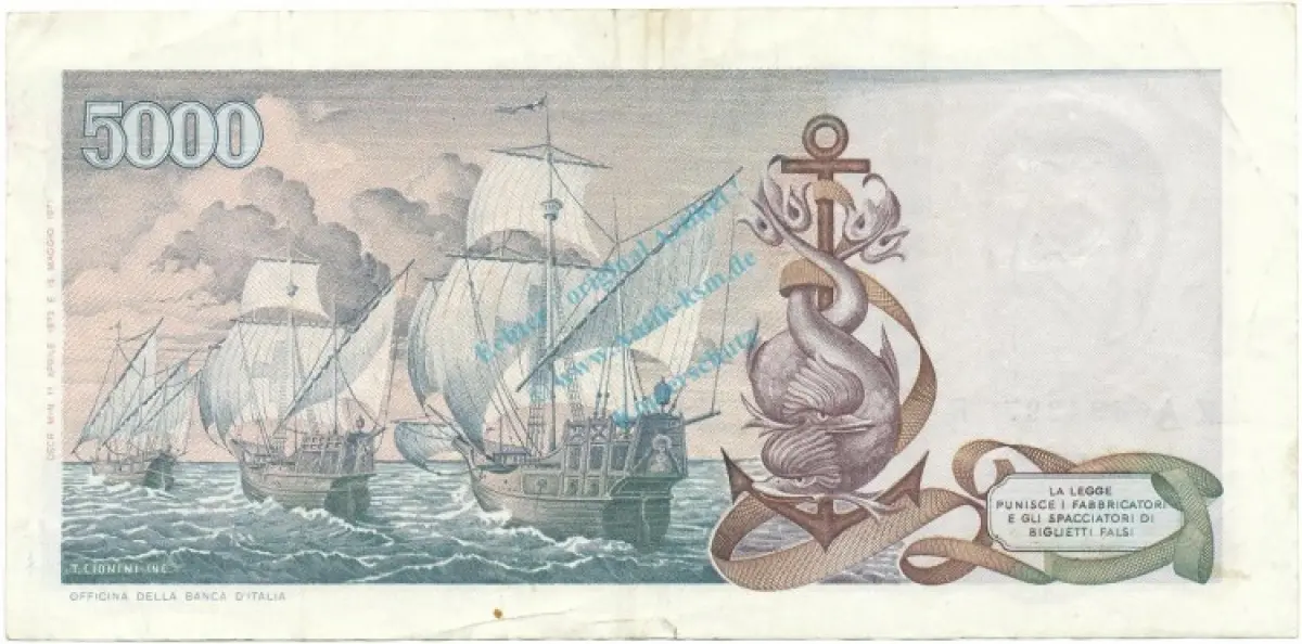 Banknote Italien , 5.000 Lire Schein 1971-77, WPM.102 -Columbus- gbr. -0335
