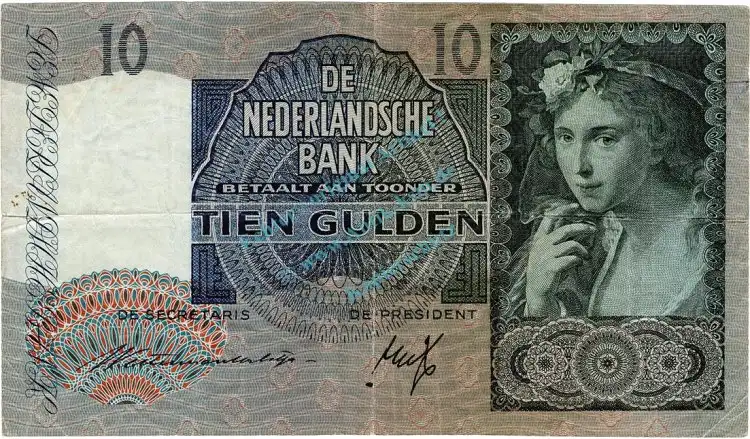 Banknote Niederlande , 10 Gulden Schein 1940-42 -Junge Frau re- gbr. P.56Banknote Niederlande , 10 Gulden Schein 1940-42 -Junge Frau re- gbr. P.56