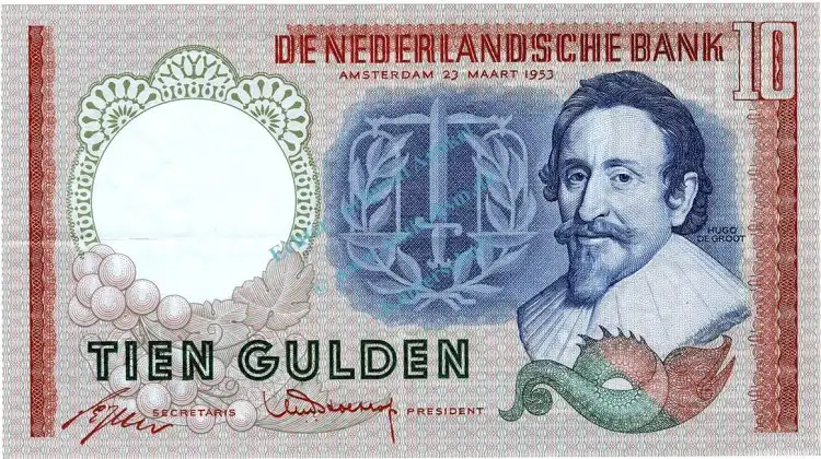 Banknote Niederlande , 10 Gulden Schein 1953 -Hugo de Groot- gbr. P.85