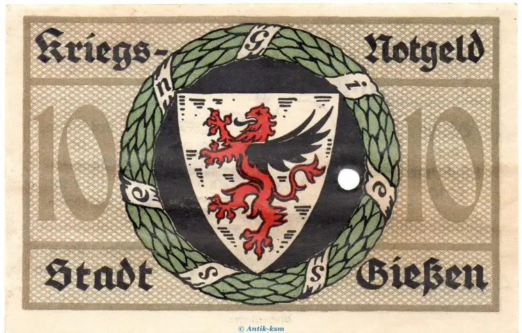 Banknote , Notgeld über Zehn Mark der Stadt Giessen , GrossnotgeldBundesland : Hessen  ,  Geiger : 178.02