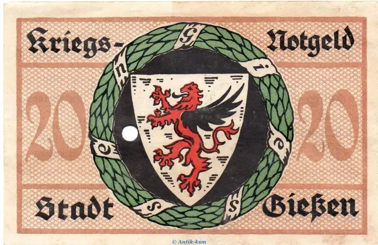 Banknote , Notgeld über Zwanzig Mark der Stadt Giessen , GrossnotgeldBundesland : Hessen  ,  Geiger : 178.03
