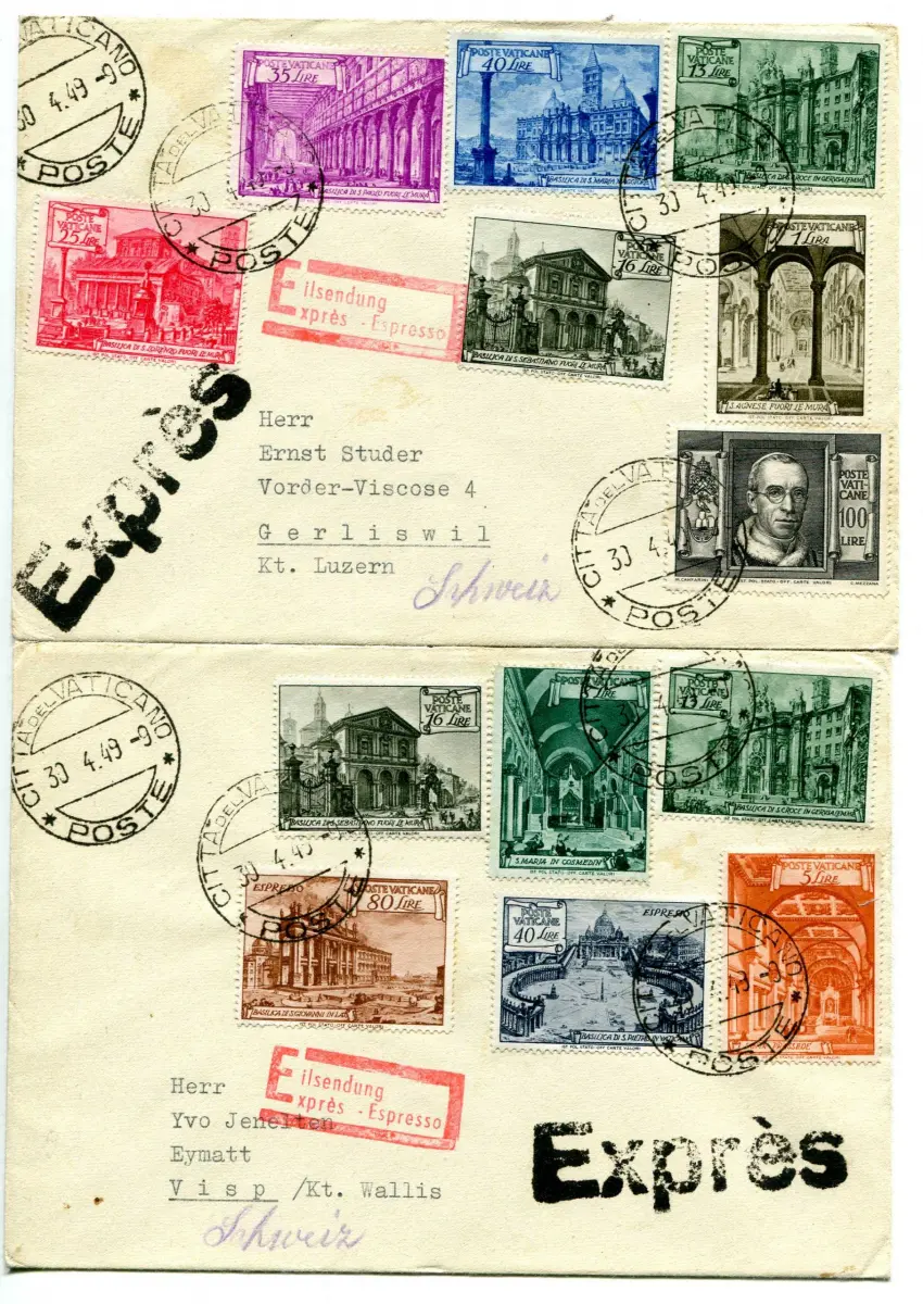 Basiliken + Espress auf zwei Umschlägen für die Schweiz - Basiliken Nr. 122/131 + Serien-Express (3 Lire fehlen) auf zwei Umschlägen für die Schweiz mit Express gereist - Schönes Set Code 827/8