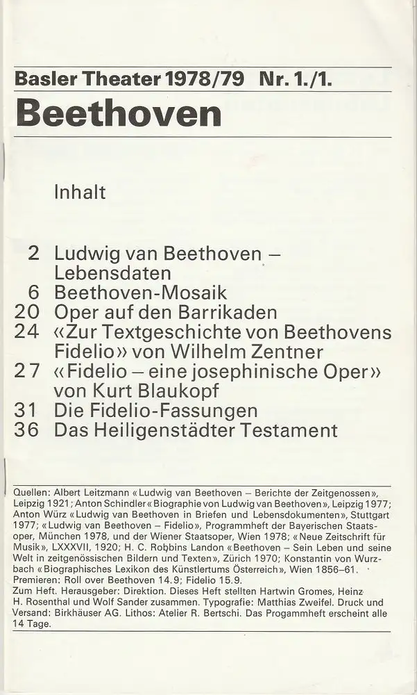Titel: Programmheft BEETHOVEN Uraufführung ROLL OVER BEETHOVEN Schauspiel von Peter Greiner 14. September 1978 Basler Theater 1978 / 79 Heft 1