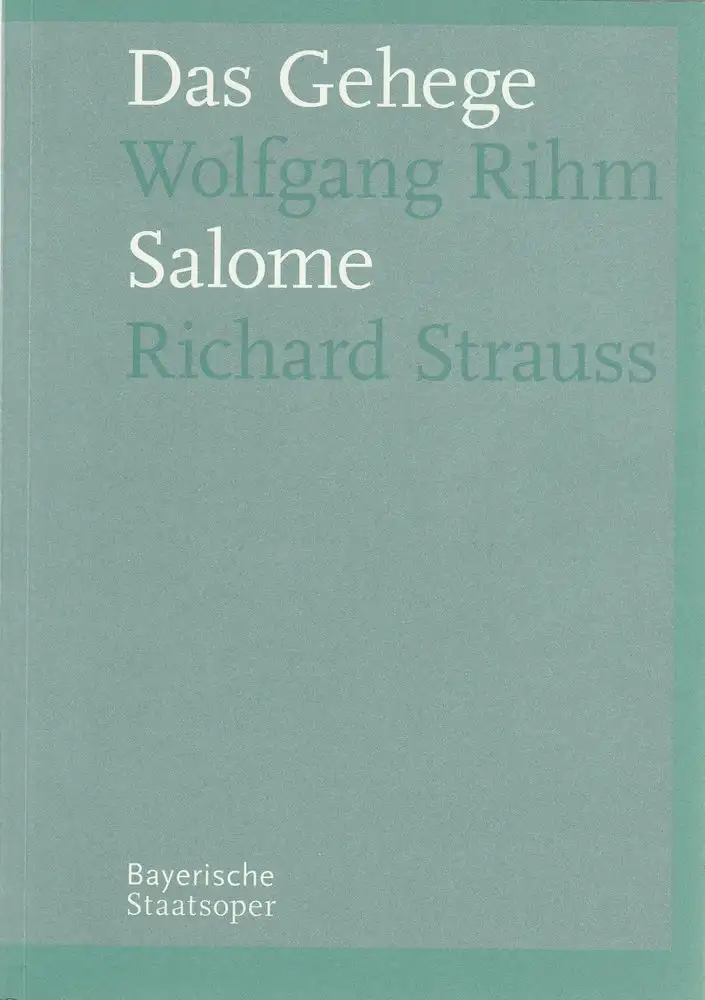 Musikalische Leitung: Kent Nagano. Inszenierung: William Friedkin. Bühne: Hans Schavernoch. Kostüme: Petra Reinhardt. Choreographie: David Bridel. DAS GEHEGE: Eine nächtliche Szene aus Schlusschor von Botho Strauß. Mitwirkende: Gabirele Schnau, Todd Ford. SALOME: Musik-Drama in einem Aufzug nach Oscar Wildes gleichnamiger Dichtung. Mit deutschen Übertiteln. Mitwirkende: Wolfgang Schmidt, Iris Vermillion, Angela Denoke, Alan Titus, Nikolai Schukoff, u. a. - Theaterprogramm, Opernprogramm, Ballettprogramm, Musicalprogramm, Konzertprogramm, Theatermemorabilia, Programmhefte Sammlung, deutsche Theatergeschichte.