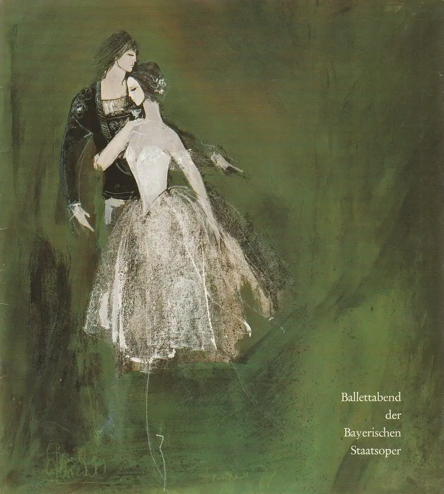 original Heft mit Original Schutzumschlag, Format ca. 21 x 23 cm, nicht paginiert, ca. 8 Seiten, 6 ganzseitige Fotos, im Umschlag 78 Portraitfotos vom Ballett der Bayerischen Staatsoper, beiliegende Besetzungsliste. Zustand: gut