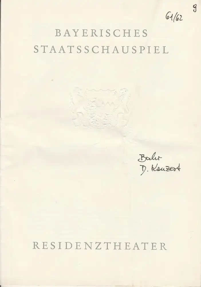 Blätter des Bayerischen Staatsschauspiels. Inszenierung: Trude Kolman. Bühnenbild: Johannes Waltz. Kostüme: Elisabeth Urbancic. Mitwirkende: Paul Hoffmann, Agnes Fink, Hans Clarin, Cordula Trantow, Charlotte Witthauer, u.a. - Theaterprogramm, Opernprogramm, Ballettprogramm, Musicalprogramm, Konzertprogramm, Theatermemorabilia, Programmhefte Sammlung, deutsche Theatergeschichte.