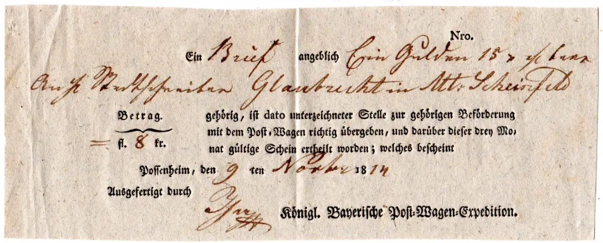Bayern 1814, Postschein f. einen Wertbrief v. Possenheim n. Mkt. Scheinfeld