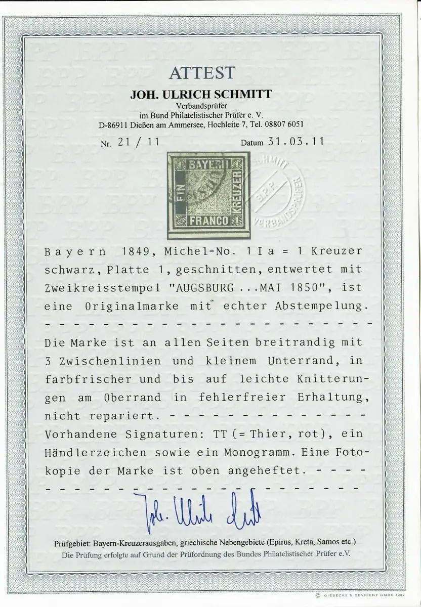 Bayern 1849 MiNr. 1 Ia, Platte 1, ungezähnt, gestempelt Augsburg mit BPP Attest