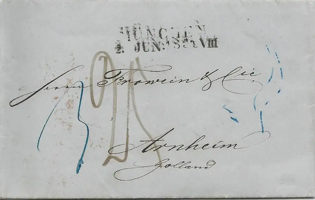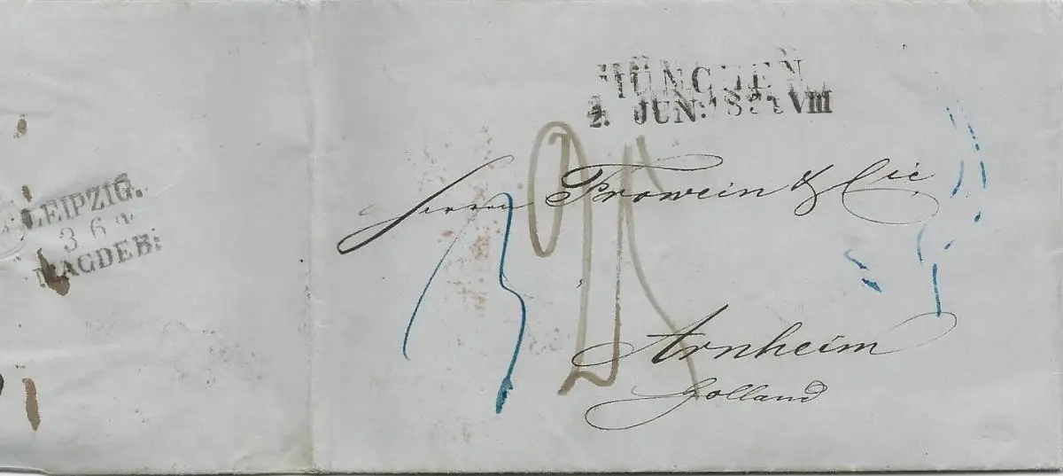 Bayern 1859, L2 München auf Porto Brief n. NL via Sachsen Bahnpost. #1832