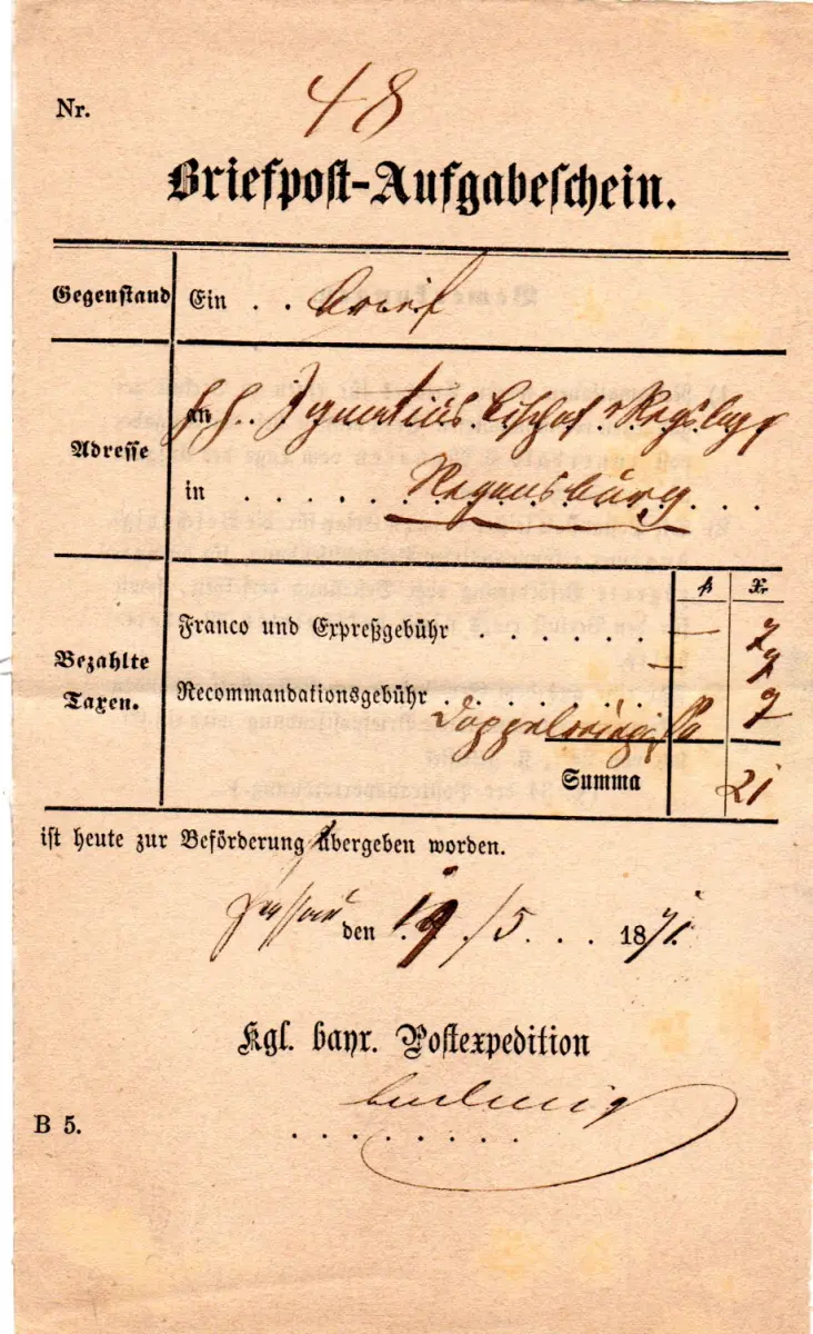 Postformular Briefpost-Aufgabeschein (waagr. mittige Faltung, siehe scan) v. "Passau, den 19/5 1871" für einen eingeschriebenen Eilboten-Brief m. Rückschein. Gesamtfrankovermerk "21" Kreuzer. Der Postschein ist vorgeduckt für Eilbotenbriefe: "Franko u. Expressgebühr..."