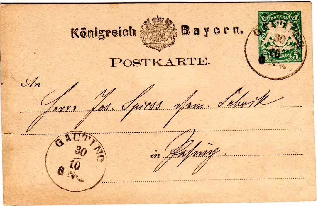 Bayern 1878, K1 GAUTING auf 5 Pf. Ganzsache n. Pasing.