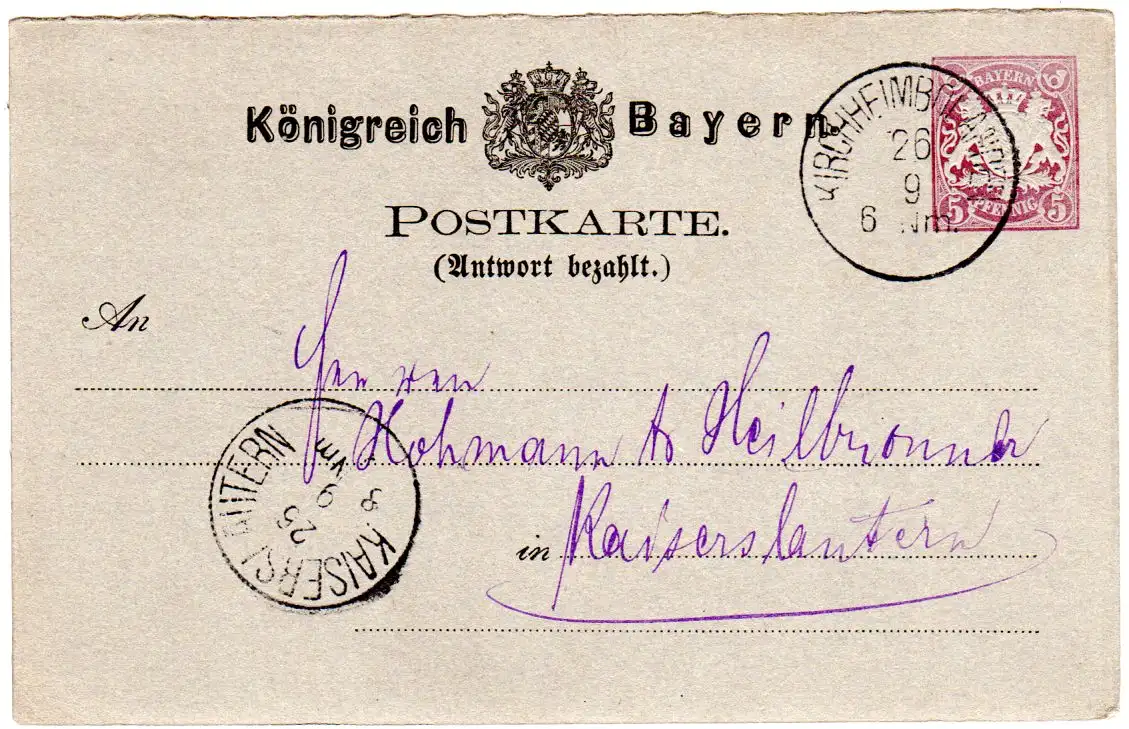 5 Pf. Ganzsachenantwortteil zurückgebracht v. K1 Kirchheimbolanden n. Kaiserslautern.