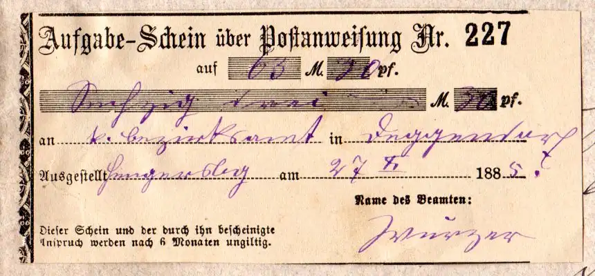 Aufgabe-Schein über Postanweisung Nr. 227 auf 63 M. 30 Pf...Ausgestellt Hengersberg am 27.X.1885