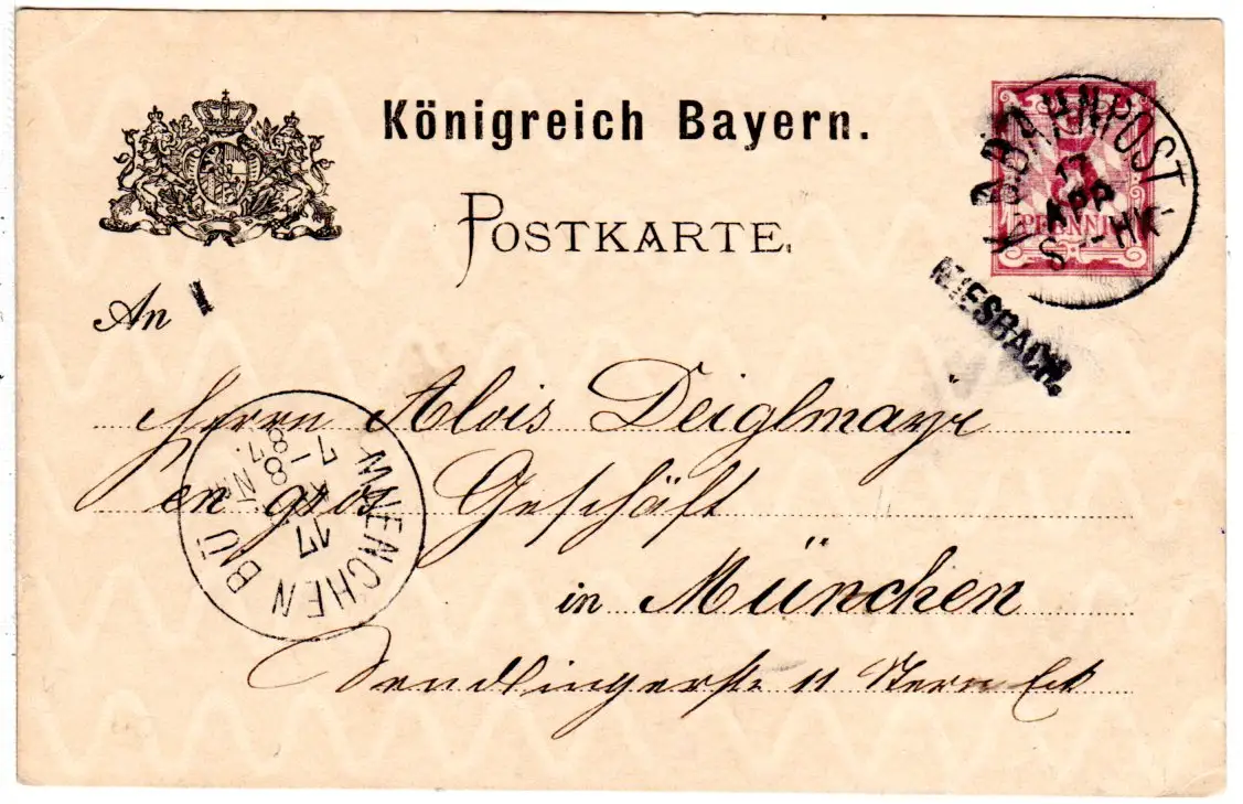 Bayern 1887, L1-Stationsstempel MIESBACH auf 5 Pf. Ganzsache m.Bahnpost S--HK