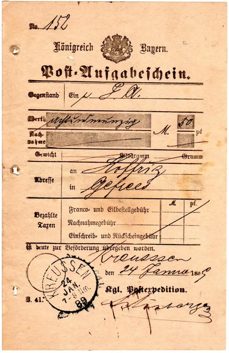 Bayern 1889, Postschein f. einen Wertbrief m. K1 Kreussen