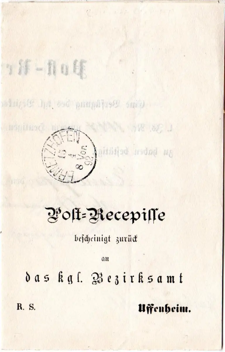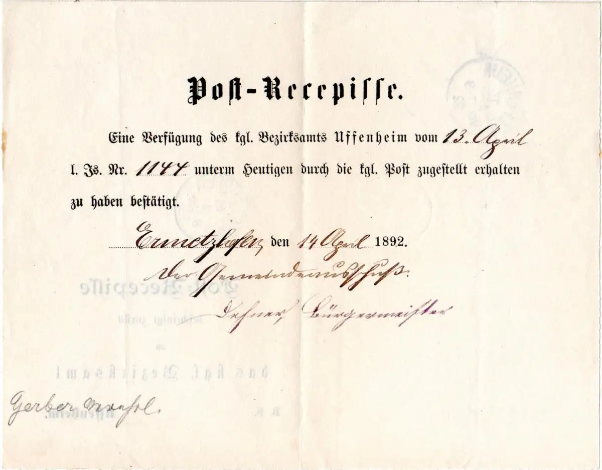 Bayern 1892, Post-Recepisse m. K1 ERMETZHOFEN n. Uffenheim