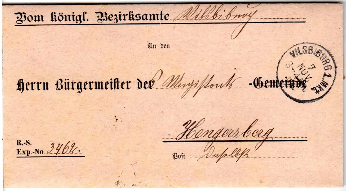 Bayern 1894, K1 Vilsbiburg 1.Mkt. auf Brief an den Bürgermeister in Hengersberg