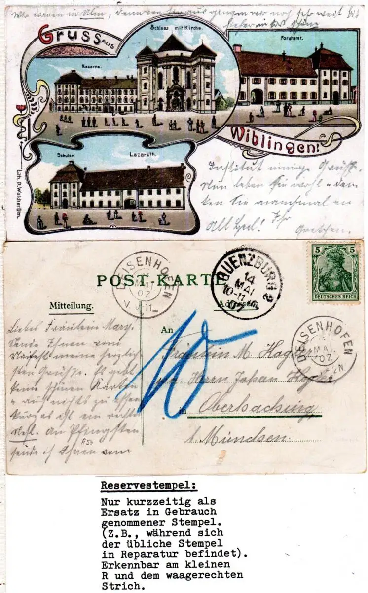 Schöne Litho-AK v. Wiblingen m. Forstamt u. Lazarett. Gebr. m. 5 Pf. Germania (in Bayern ungültig) ab Günzburg. Porto "10" Pf. u. Ank.Stpl. Deisenhofen R.