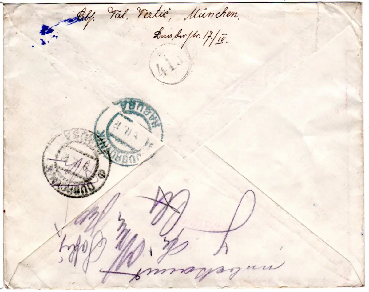 Brief n. Ragusa, Dalmatien, Österreich m. hds. u. Etikett " Unbekannt" sowie blauem Cachet Portier Hotel Imperial Ragusa u. "Retour München". Weitere Vermerke u. 2-sprachige Stempel Dubrovnik Ragusa rückseitig.