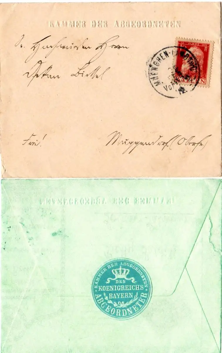Umschlag m. Prägung Kammer Der Abgeordneten u. 10 Pf. nach Muggendorf Oberfranken. Rückseitig blaues Verschlussetikett.