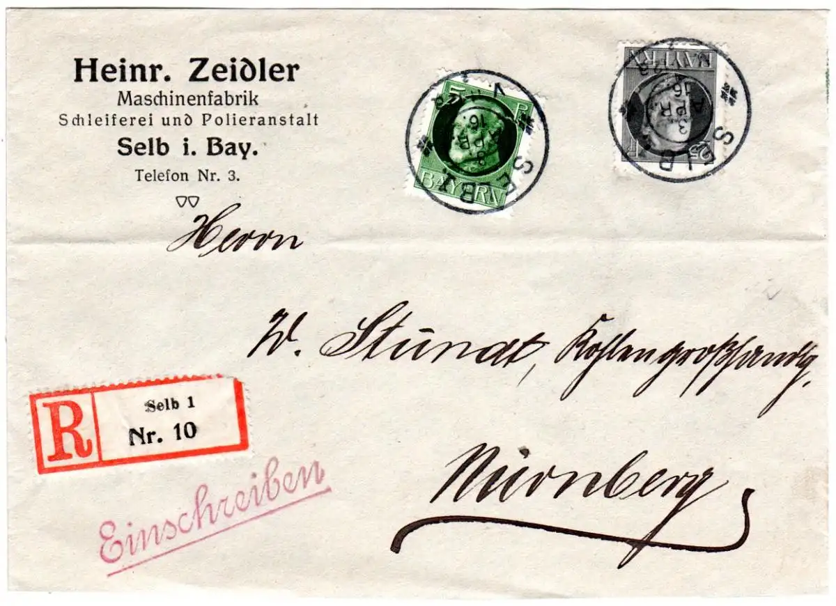 Bayern 1916, 25+5 Pf. auf Firmen Einschreiben Brief v. Selb n. Nürnberg