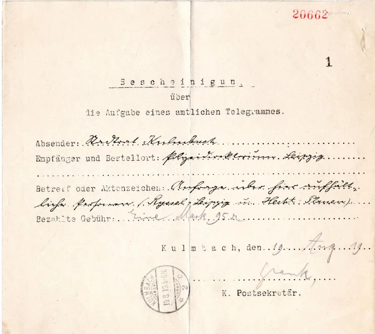 Bayern 1919, Telegramm - Postformular m. K1 Kulmbach 2b